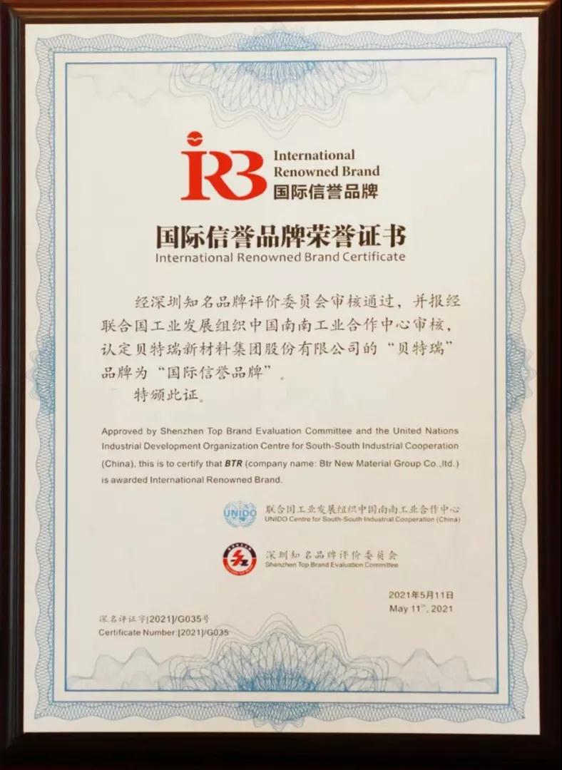 贝特瑞扎根深圳这方热土,20多年在新能源行业默默耕耘。2013年以来,贝特瑞的负极材料出货量已经连续8年位列全球第一。在2020年7月,贝特瑞20岁成年之际,成功登陆新三板精选层。如今,贝特瑞已经形成产业链联动,并努力打造新能源产业集群。此次荣获“国际信誉品牌”称号,既是对贝特瑞过去深耕于锂电池负极材料行业的褒奖与认可,也成为贝特瑞为新能源、新未来而继续努力的勋章与力量。