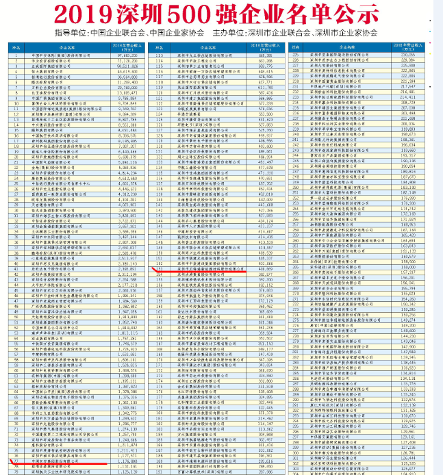 深圳500强企业公布 集团入围百强 贝特瑞排153位
